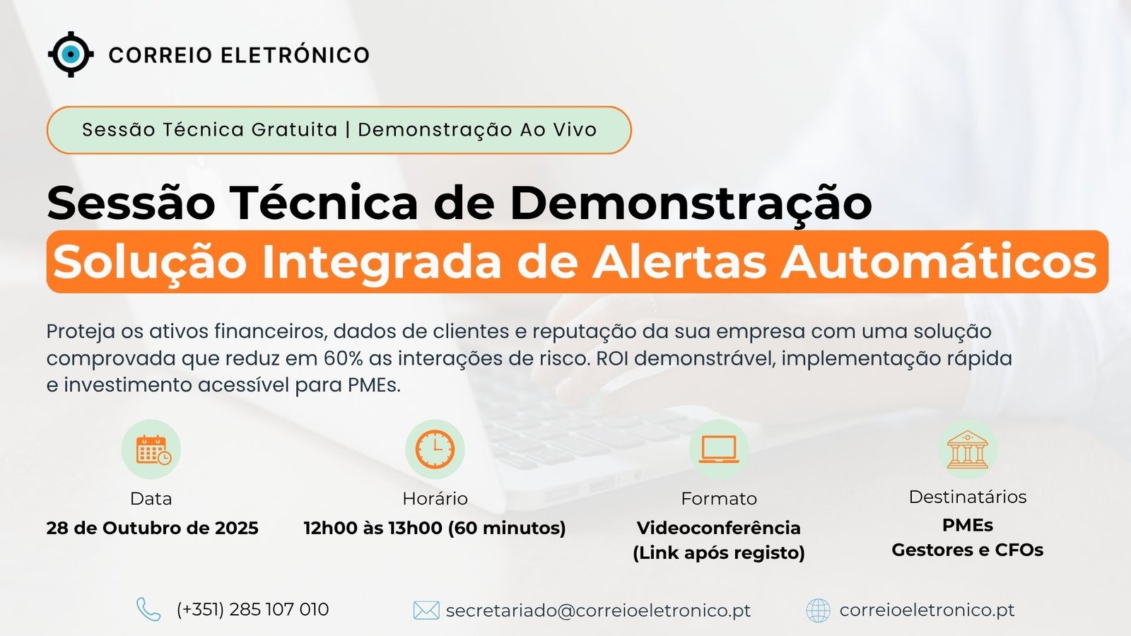 73% das PMEs portuguesas sofreram tentativas de ciberataque por email no último ano. Proteja ativos financeiros, dados de clientes e reputação com solução integrada de implementação rápida e investimento acessível.
